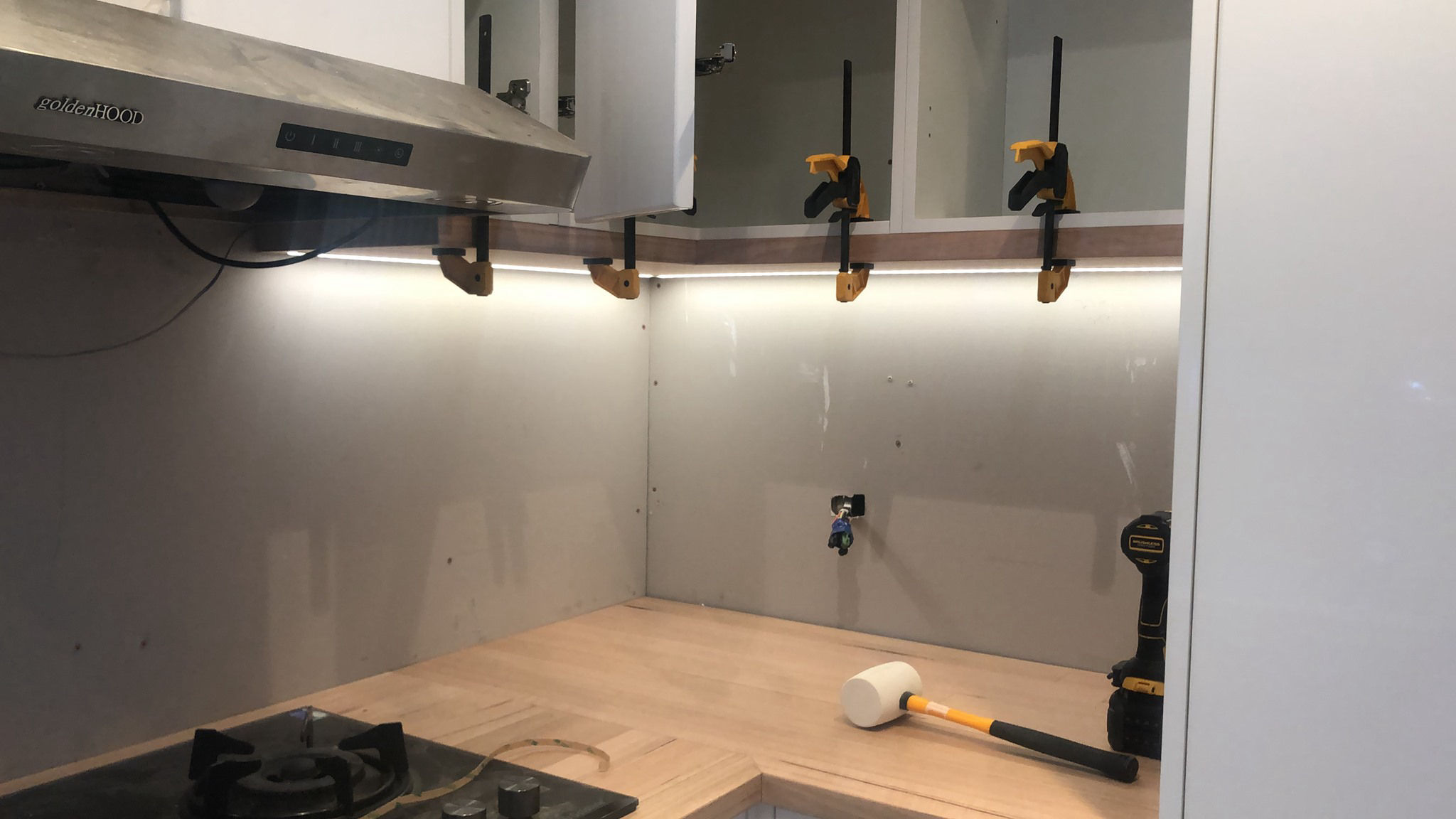 Custom LED strip lighting and diffusers routed into overhead benchtop material (cont)
